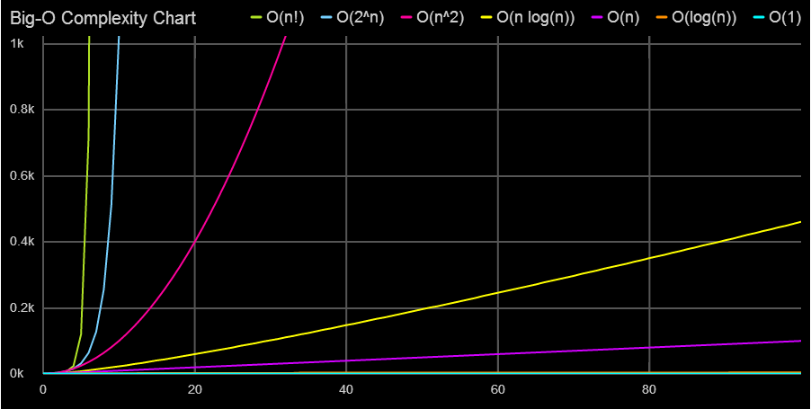 O(1)<O(logn)<O(n)<O(nlogn)<O(n²)<O(n²logn)<O(n³)<O(2ⁿ)<O(n!)<O(nⁿ)