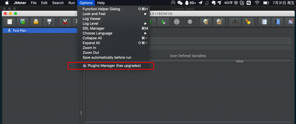 3.重启jmeter即可在选项菜单中有Plugins Manager选项
