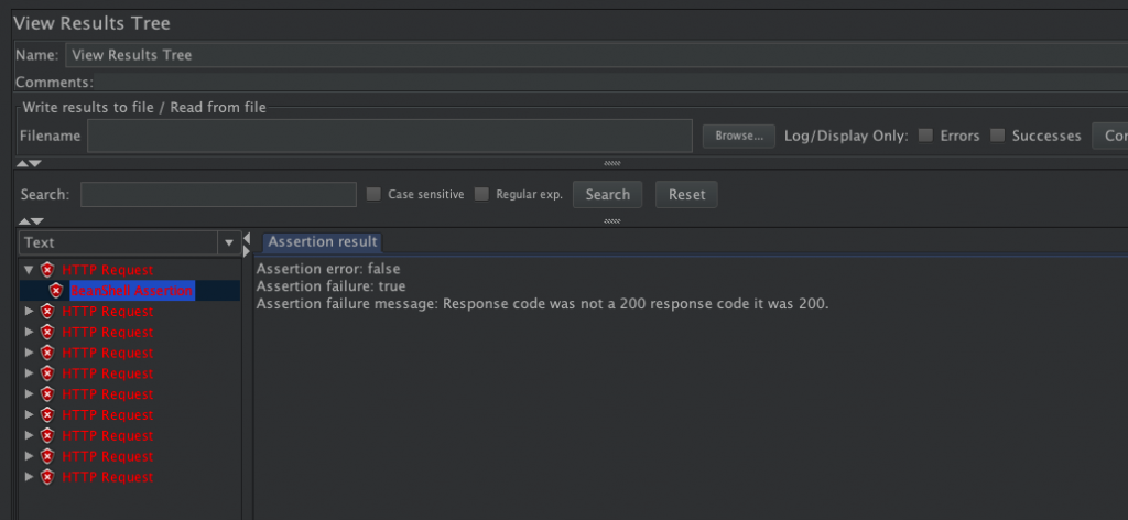 现在我们用ResponseCode来判断,等于200时,设置为断言失败,写入如下代码: