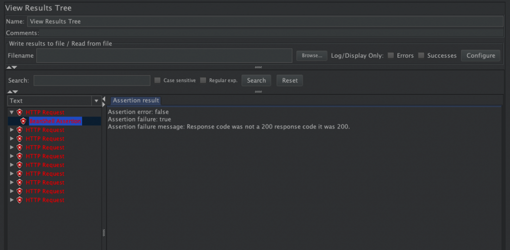 注:在没有对请求断言的情况下,显示绿色并不一定是成功,只代表响应码是200或300系列,显示红色说明响应码是400或500系列。所以要想确定请求返回的是正确的,必须要加上断言,只有断言成功才会显示绿色。