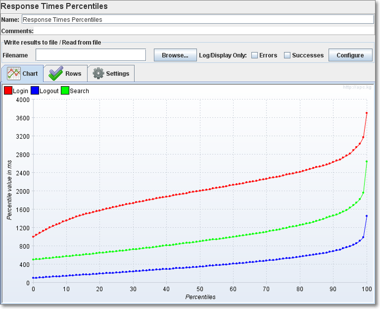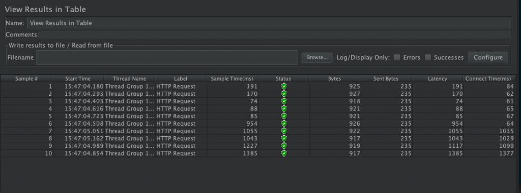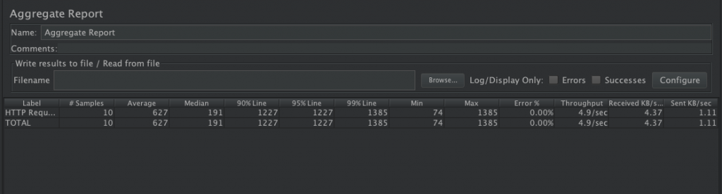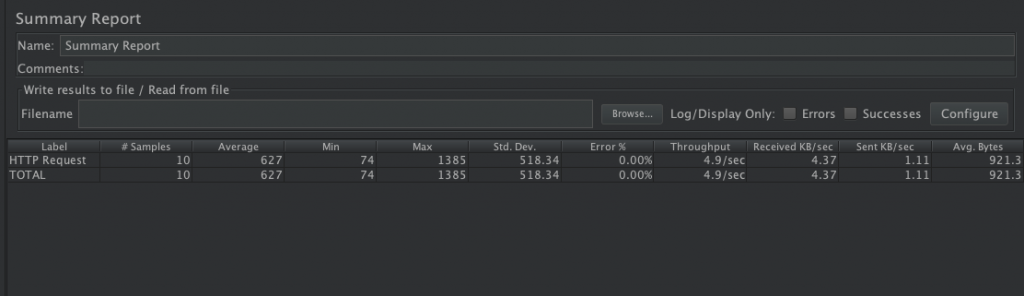 该监听器对于每个请求,它统计响应信息并提供请求数,平均值,最大,最小值,中位数、90%、95%、错误率,吞吐量(以请求数/秒为单位)和以kb/秒为单位的吞吐量。