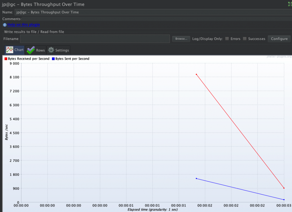 聚合报告里,Throughput是按请求个数来展示的,比如说1.9/sec,就是每s发送1.9个请求;而这里的展示是按字节Bytes来展示的图表,每秒传输字节吞吐量,表明Jmeter在测试时,随着时间推移发送和接受的字节数