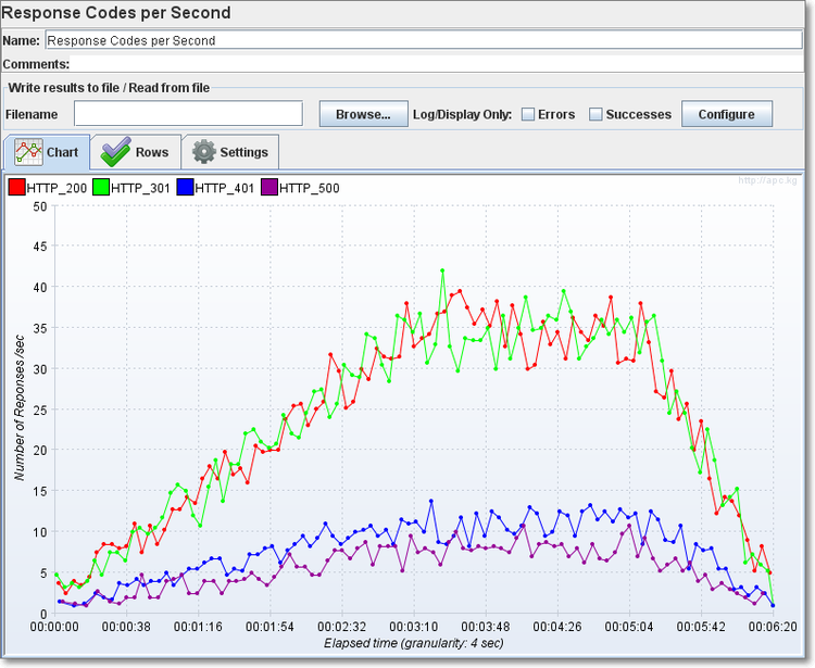 每秒返回的响应码,表明Jmeter测试期间,随着时间的推移返回的响应码,从中我们可看到测试期间在哪个时间段内出现了错误。就可以分析在该时间内系统的什么环境因素,导致的错误