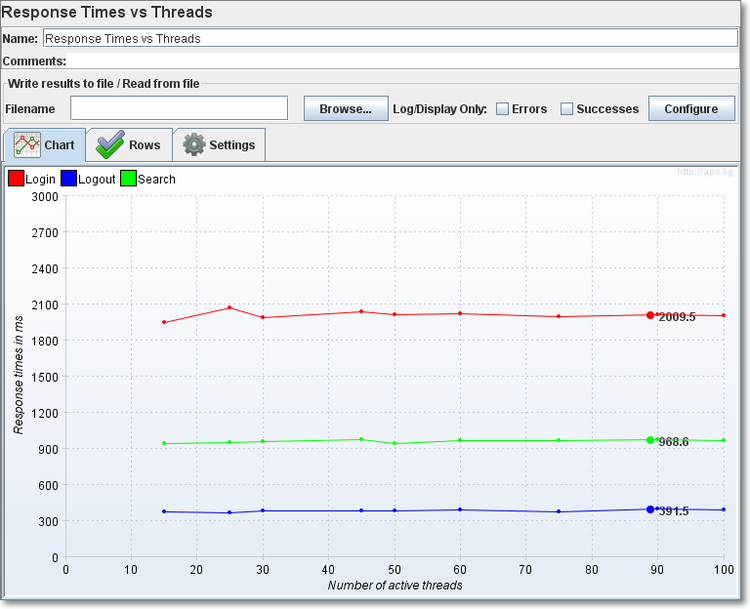 监听整个事物运行期间的响应时间。其中横坐标是运行时间,纵坐标是响应时间(单位是毫秒), 系统的响应时间的变化,可以看出响应时间稳定性