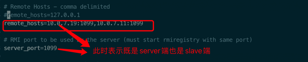 (3)在server机器的jmeter安装目录下bin目录下,找到properties文件,修改远程主机选项,添加2个agent服务器的地址。