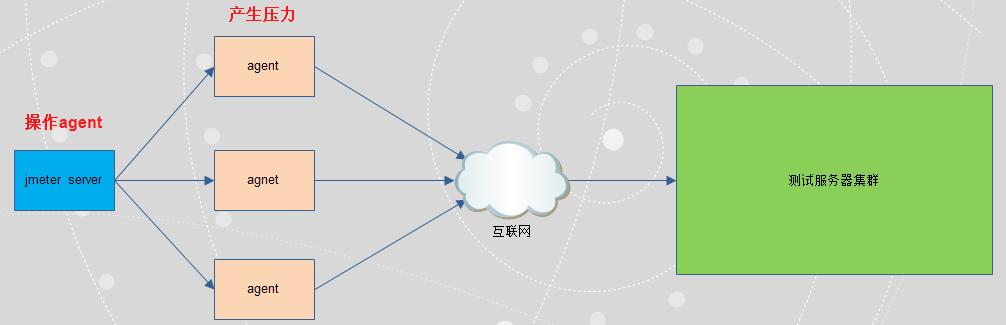 在工作中使用jmeter做大并发压力测试的场景下,单机受限内存、CPU、网络IO,会出现服务器压力还没有上去,但是压测服务器已经由于模拟的压力太大死机了。为了让jmeter工具提供更强大的负载能力,jmeter提供了多台机器同时产生负载的机制,下面是架构图。