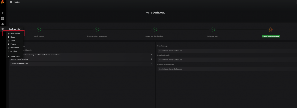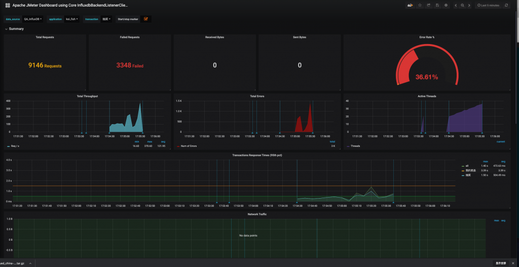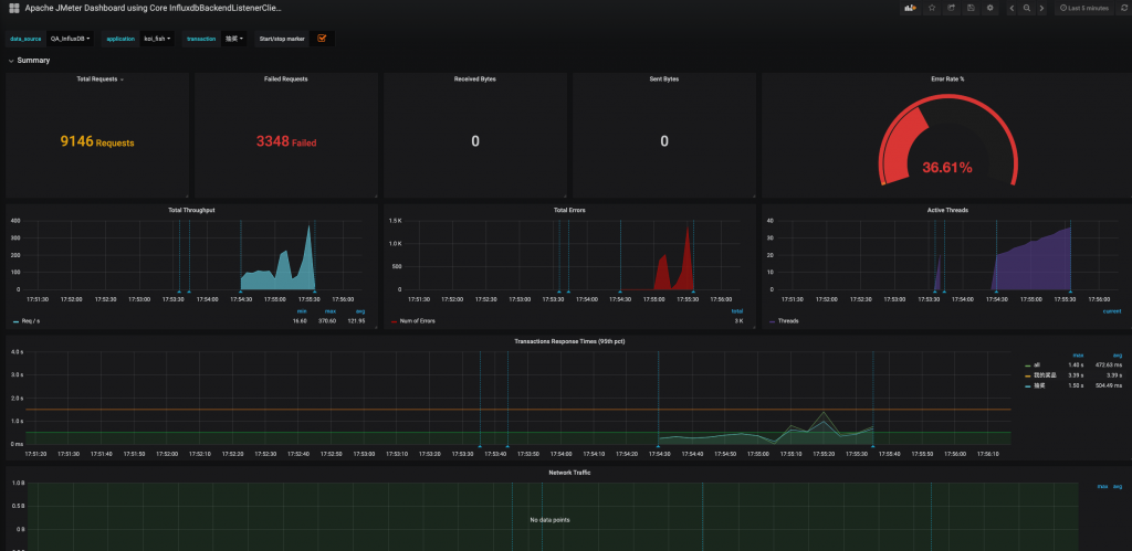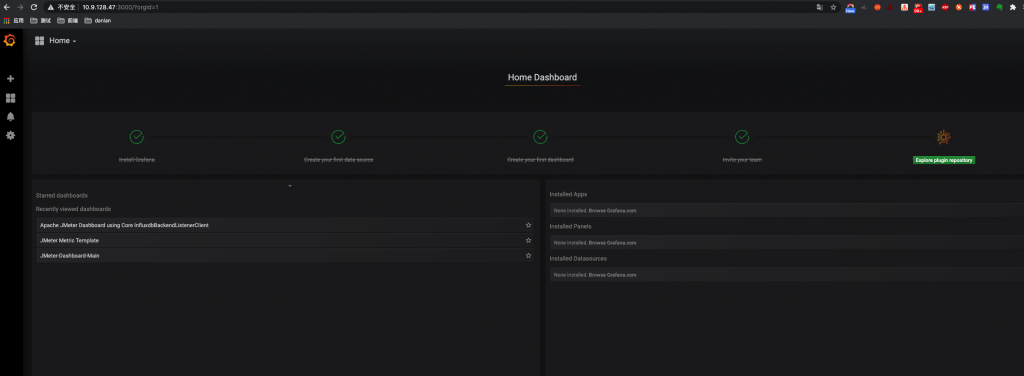 基本上,就是Jmeter通过“Backend Listener”,将测试的数据上传到我的虚拟机上,通过InfluxDB来存储,Grafana来展示出来。我们访问web,稍微配置一下,就可以看到展示的数据了。