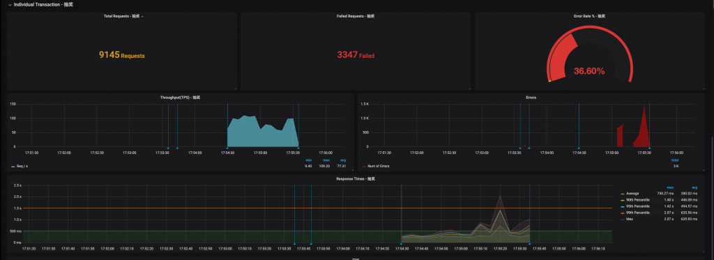 这样看都没有问题,对于压力工具来说,我们最多只关心三条曲线的数据:TPS(T 由测试目标定义)、响应时间、错误率。这里的错误率还只是辅助排查问题的曲线,没有问题时,只看 TPS 和响应时间即可。