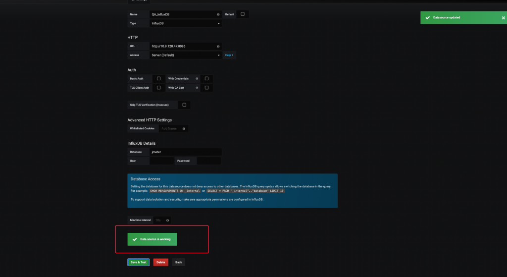 添加InfluxDB数据库配置。输入帐号密码“admin / admin”,点击Test & Save 提示“Success”说明成功了
