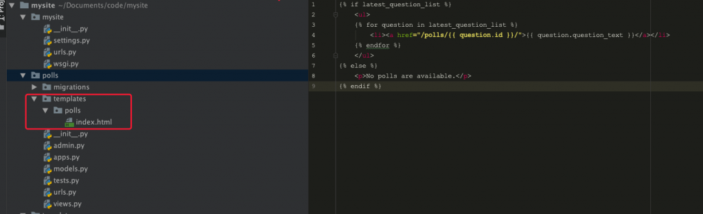 在你刚刚创建的 templates 目录里,再创建一个目录 polls,然后在其中新建一个文件 index.html 。换句话说,你的模板文件的路径应该是 polls/templates/polls/index.html 。因为 Django 会寻找到对应的 app_directories ,所以你只需要使用 polls/index.html 就可以引用到这一模板了。