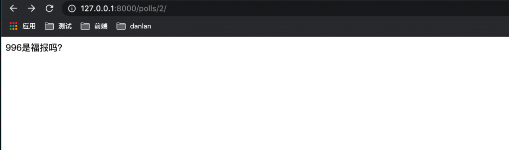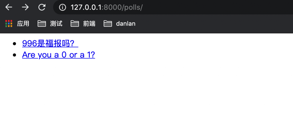 用你的浏览器访问 "/polls/" ,你将会看见一个无序列表,列出了我们在之前添加的 “0还是1”和“996是福报吗” 投票问题,链接指向这个投票的详情页。