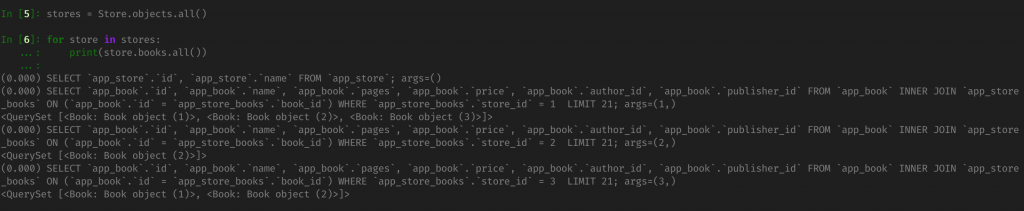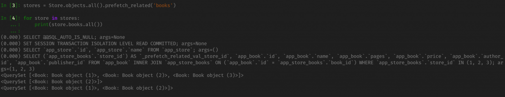 通过看使用prefetch_related的查询SQL,可以发现在第二查询的时候,加了WHERE 条件where store.id in (1,2,3),从而查库1+1次,而不是未使用优化时,每次遇到store.books.all(),才去查库,导致查库1+3次。