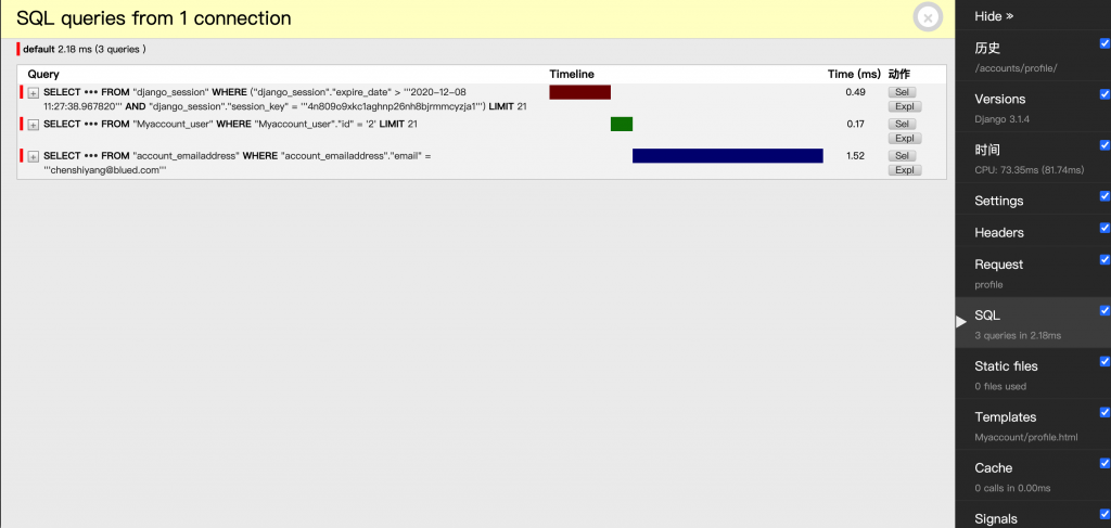 当你安装好debug_toolbar后,启动django服务器,打开任何一个页面你都可以看到查询数据库所花时间以及是否有相似及重复的查询,如下图所示: