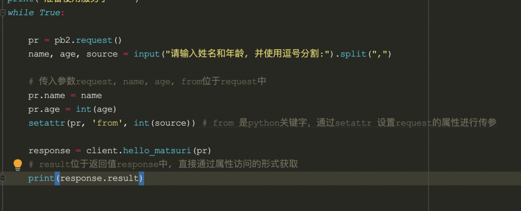 response = client.hello_matsuri(pb2.request(name=name, age=int(age), from=source))