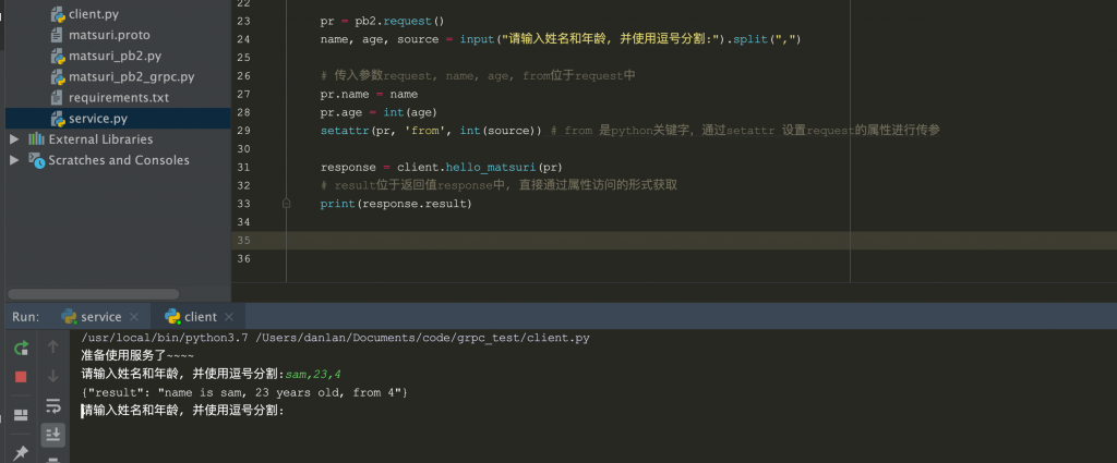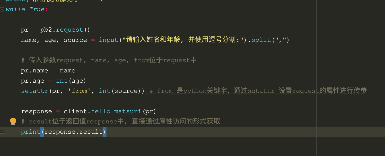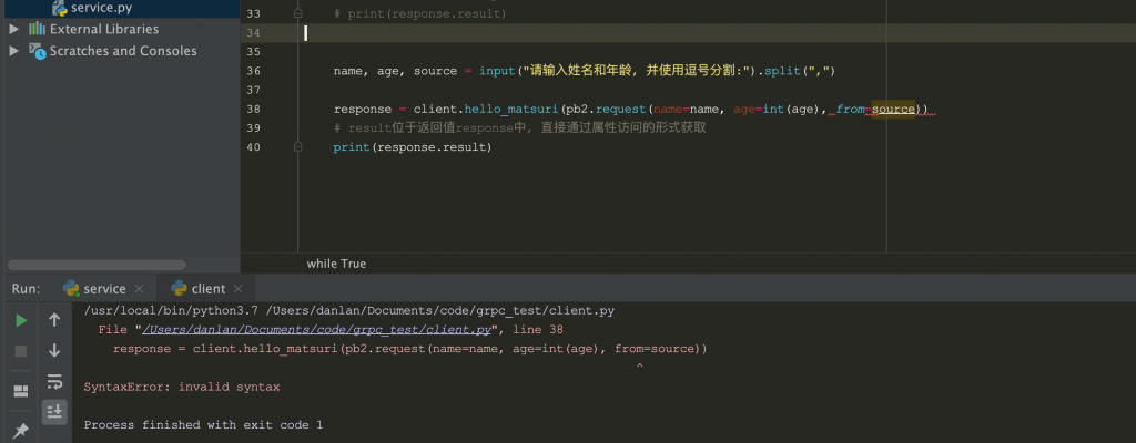 print(response.result)不知道大家有没有发现问题,proto里定义的from字段是python的关键字,client调用的时候关键字冲突语法错误